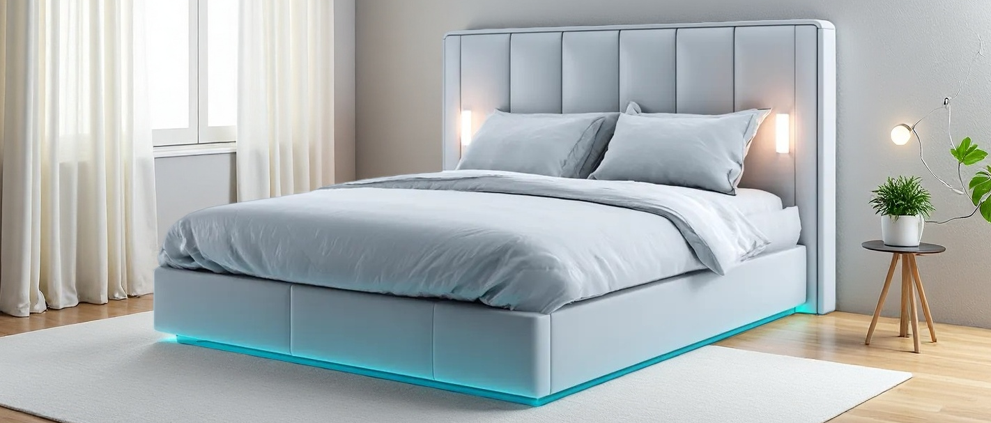 Cama doble tapizada 200x160x115cm - gris claro - para dormitorio - diseño moderno con iluminación LED